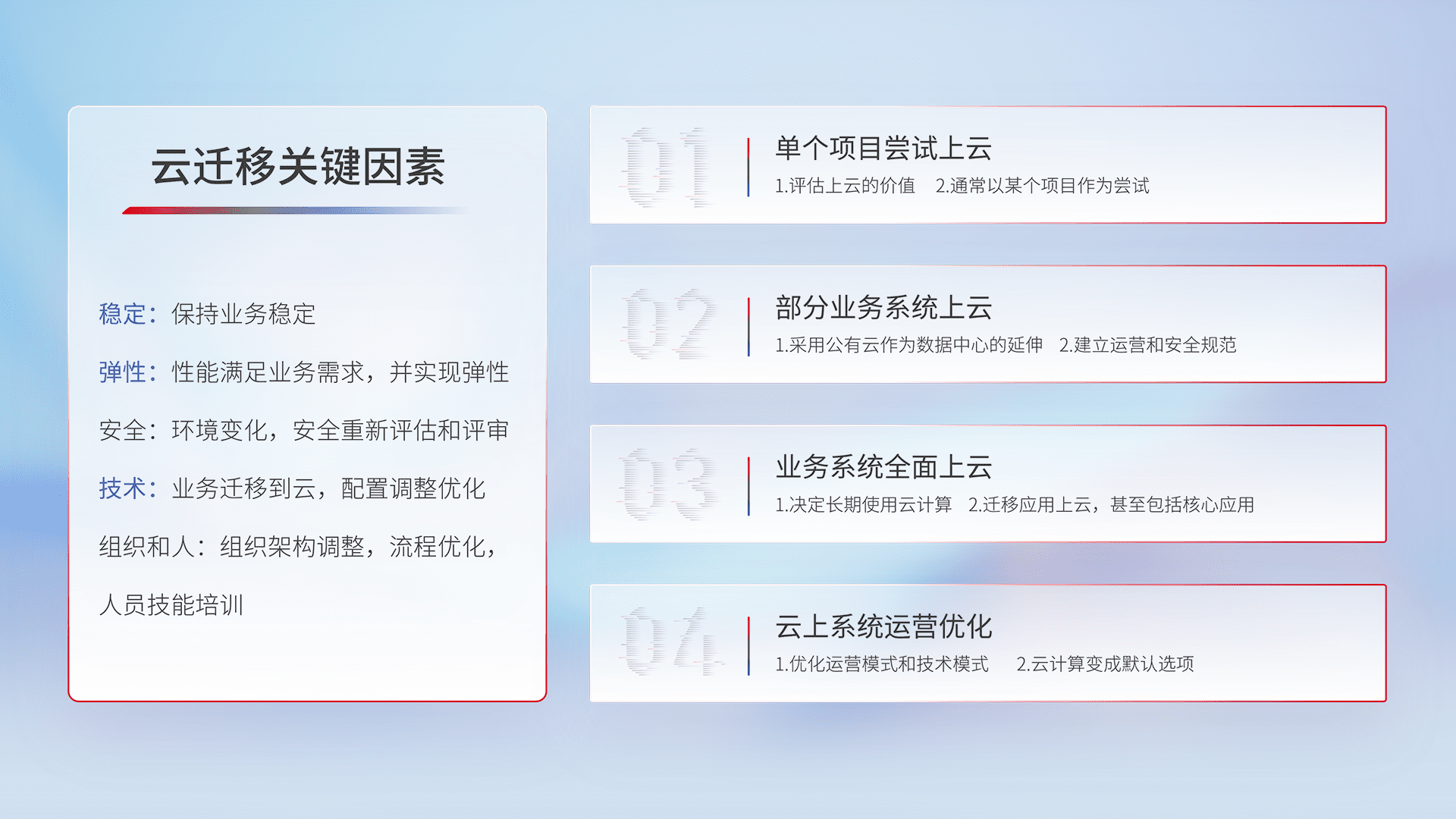 结合实际业务,,,从规划设计、、、、云平台选型、、、云原生改造、、数据迁移、、集成交付,,迁移全过程为客户识别最佳上云路径,,,做好风险识别管理,,,设计网络架构、、身份权限、、、安全审计合规、、操作审计、、日志审计、、监控告警策略、、多站点容灾设计等,,,对云上基础设施进行整体规划,,,提升IT治理水平,,,以满足弹性、、、高可用、、、、高性能的需求。。。