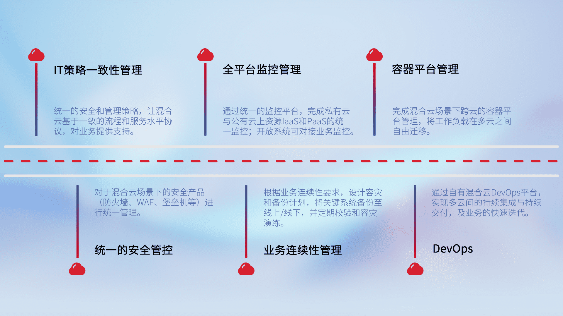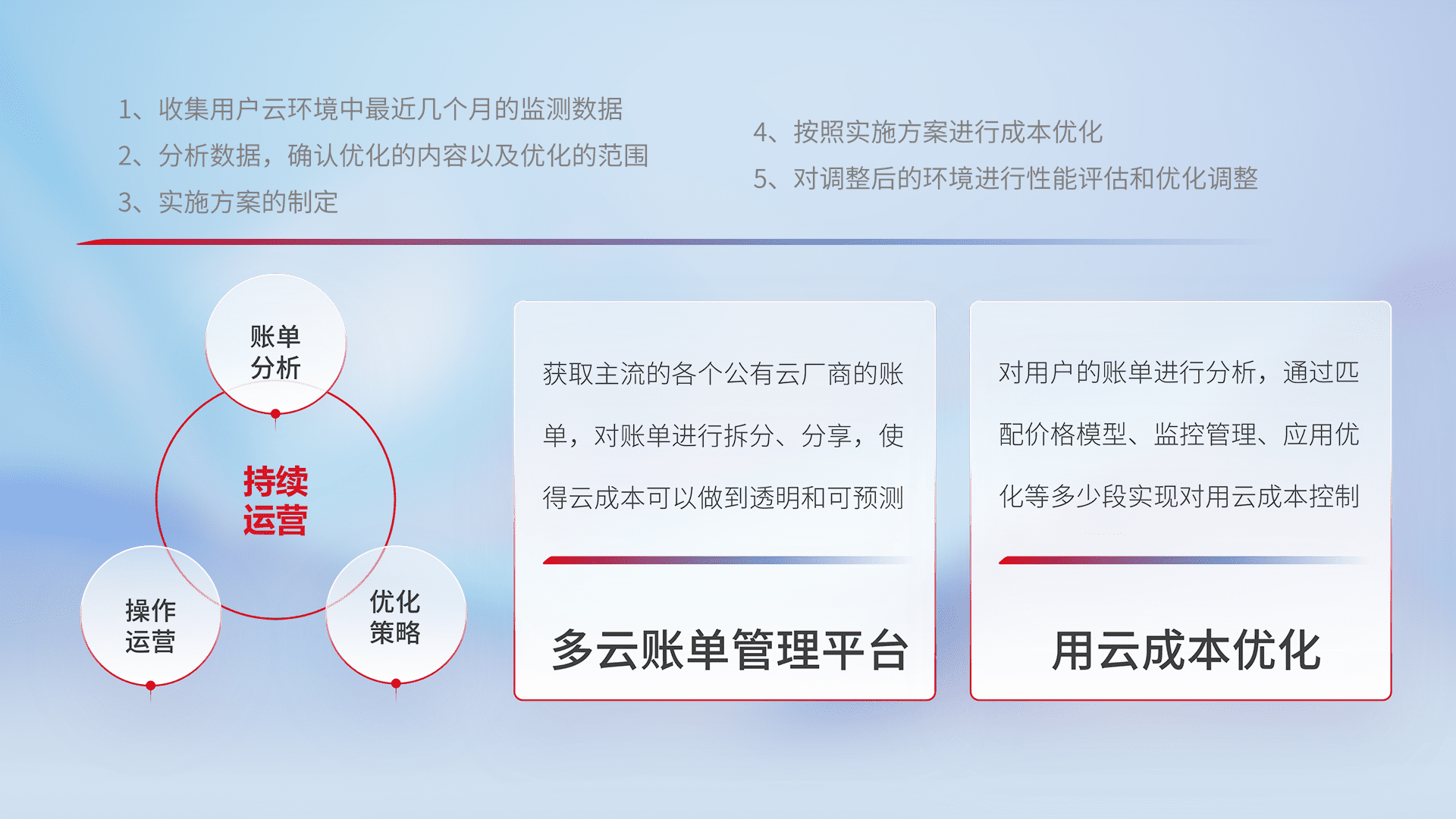 通过多云纳管,,以统一的资源数据模型把客户的云资源进行抽象和封装,,,,进而实现对多云资源的统一操作,,,保障云资源管理的可靠性、、稳定性与可用性。。量身定制化运维内容,,配置、、、开发运维、、、、补丁管理、、备份、、、、监控、、认证和访问管理、、审计和日常巡检等,,保障在用云过程中的可靠度,,,稳定度以及高可用率。。。。