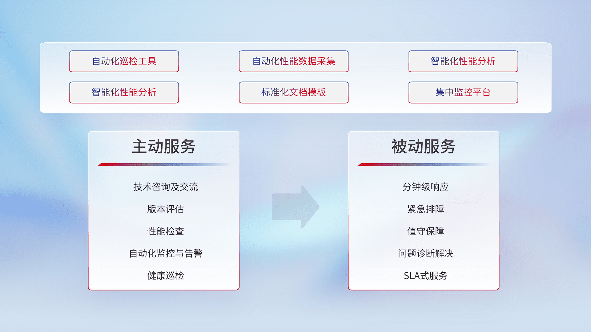 智能化工具和标准化文档,,保障服务质量,,,,提供主动服务(包含技术咨询、、版本评估、、性能检查、、、、自动化监控与告警、、、、健康巡检)和被动服务包含(分钟级响应、、、紧急排障、、值守保障、、、、问题诊断解决、、、SLA服务)。。。